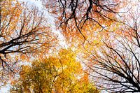 Opwaarts uitzicht in een zonnig bos tijdens een prachtige mistige herfstdag met bruingouden bladeren. De bosgrond van het Speulder- en Sprielderbos in het Veluwse natuurgebied is bedekt met bruin gevallen bladeren en het pad verdwijnt in de verte. De mist geeft het bos een desolate sfeer.