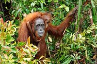Close-up van een orang-oetan met jong omringd door weelderig gebladerte in een tropisch regenwoud - locatie: Indonesië, Borneo