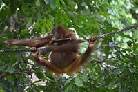 Een orang-oetan zwaait sierlijk aan een touw te midden van het weelderige groen van het Borneose regenwoud. Vastgelegd midden in de beweging bij het Sepilok Orangutan Rehabilitation Centre in Maleisië, tonen zijn expressieve ogen en sterke ledematen zowel kracht als behendigheid. Het levendige jungletafereel en het gefilterde zonlicht bieden een uniek inkijkje in het leven van een van ’s werelds meest bedreigde primaten.