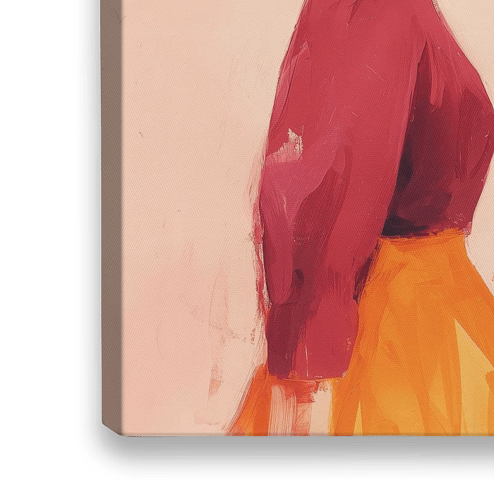 Een digitale illustratie in warme, contrasterende tinten van rood en oranje tegen een zacht roze achtergrond. Het werk toont een elegante pose in zijaanzicht, gekenmerkt door een kort zwart kapsel, een rode coltrui en een opvallende oranje oorring. De minimalistische stijl en gedurfde kleurkeuze creëren samen een moderne, fashionable uitstraling.