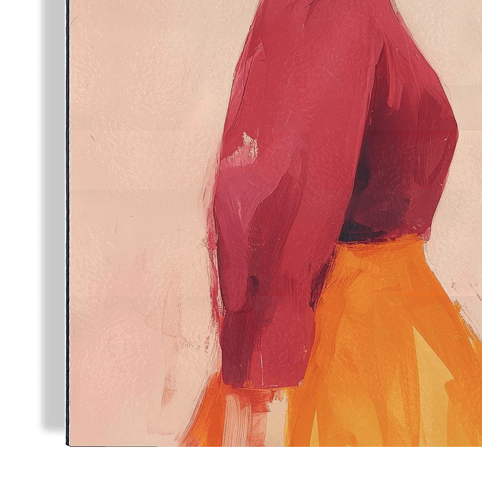 Een digitale illustratie in warme, contrasterende tinten van rood en oranje tegen een zacht roze achtergrond. Het werk toont een elegante pose in zijaanzicht, gekenmerkt door een kort zwart kapsel, een rode coltrui en een opvallende oranje oorring. De minimalistische stijl en gedurfde kleurkeuze creëren samen een moderne, fashionable…