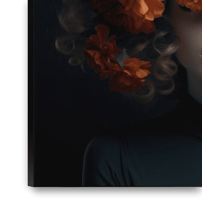 Een vrouw met sprankelende blonde krullen, versierd met levendige oranje bloemen. De manier waarop de bloemen verweven zijn met haar krullende lokken geeft het geheel een modieuze en stijlvolle uitstraling. Dit beeld, dat het midden houdt tussen fine art en modefotografie, toont een unieke balans tussen natuurlijke schoonheid en moderne…