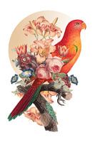 Een oranje papegaai op stok, gecombineerd met bloemen uit een antiek stilleven.