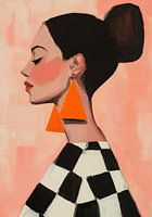 Dit werk toont het zijprofiel van een vrouw met opgestoken haar, die rust uitstraalt in haar houding en gesloten ogen. De achtergrond bestaat uit roze tinten met zichtbare penseelstreken, die de textuur van het doek voelbaar maken. De vrouw draagt een opvallende outfit met een zwart-wit geblokt patroon en grote oranje driehoekige…