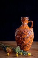 Stilleven met een grote oranje retro vaas en enkele bloementakken. Hoewel het nu als siervaas zeer decoratief is, is de vaas in werkelijkheid een voet van een staande schemerlamp geweest in de jaren 70. Dit keramiek komt uit Duitsland.