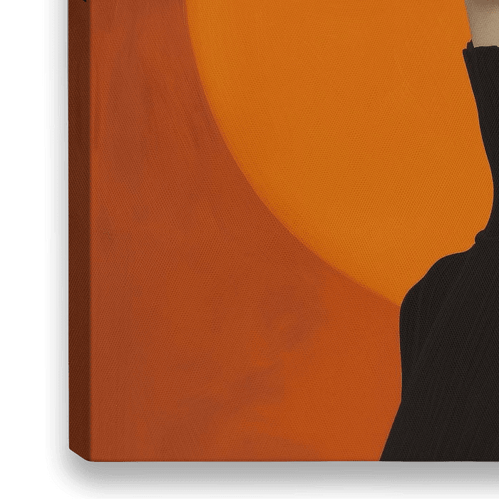 Afbeelding van een prachtige vrouw met zwart haar en een zwarte trui. Mooi contrast tegen de oranje achtergrond. De oranje cirkel staat symbool voor de zon, een nieuwe kans elke dag. Nostalgie, weemoed in contrast met kansen.