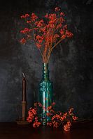 Oranje Gipskruis in een blauwe fles. Een prachtig tijdloos stilleven. prachtig groot aan de muur. Ik maak deze stillevens in mijn thuisstudio op Texel. Ik verzamel leuke spulletjes bij antiek winkels of rommelmarkten, weet van te voren nooit wat ik ermee ga doen, de verrassing is dat des te leuker!