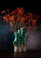 Oranje Gipskruis in bijzondere vaas. Mijn eerste stilleven gemaakt in mijn nieuwe studio, een voor mij nieuwe tak van fotografie, prachtig groot aan de muur.