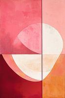 Een strak geometrisch kunstwerk in warme roze, rode en terracotta tinten, waarin halve cirkels en lijnen een harmonisch samenspel vormen. De compositie straalt rust en balans uit door het gebruik van zachte kleurovergangen en de symmetrische verdeling van de vormen. Het moderne minimalistische ontwerp heeft een kalmerend effect en brengt tegelijk dynamiek door de speelse plaatsing van de geometrische elementen.