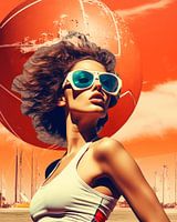 Retro bold fashion en sportieve afbeelding. Mixed media. Portret van een vrouw in sporthemd op een oranje achtergrond. Enigszins abstract door de ronde vorm van een basketbal die samensmelt met de oranje kleurschakeringen in de achtergrond. Mediterraans met de zee een boten op de achtergrond. De grote zonnebril complementeren dit prachtig zomers tafereel. Sportief. Balsport. Beweging. Passend bij diverse stijlen en trends. Peach Fuzz. Modern Abstract. Tangerine Twist.