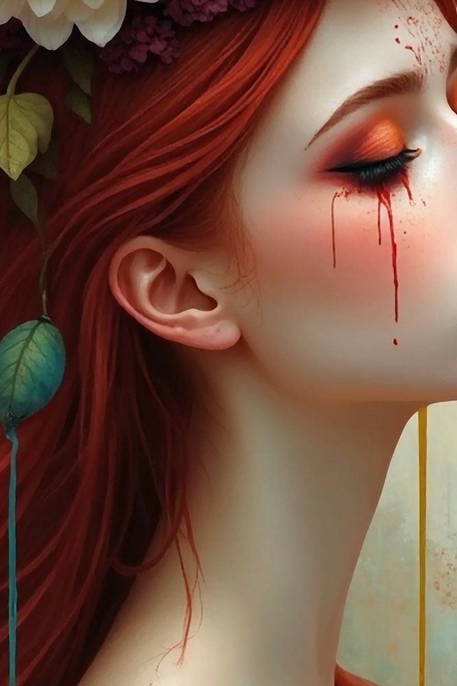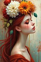 Dit schilderij vangt de krachtige en elegante uitstraling van een vrouw met stralend oranje haar en kleding, omlijst door een delicate bloemenkrans in oranje en witte tinten. Haar expressieve make-up in warme kleuren versterkt haar mystieke en artistieke schoonheid. Dit kunstwerk is perfect voor een interieur dat energie, warmte en verfijnde kunst omarmt.