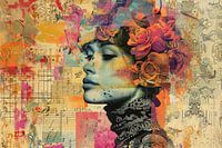 Een kleurrijk portret met expressieve oranje en rode bloemen, verweven in een schilderachtige collage van lagen en textuur. De warme tinten passen prachtig in Bohemian, Eclectische en Modern Chic interieurs en geven elke woonkamer of slaapkamer een levendige uitstraling. Dit werk ademt kracht en creativiteit, als een poëtische ode aan kleur en vrouwelijkheid.