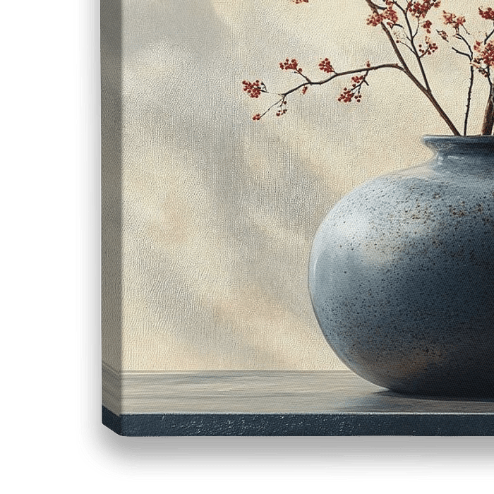 Dit kunstwerk straalt een diepe rust uit, waarbij de delicate oranje bloesems in een robuuste blauwe vaas een prachtig contrast vormen met de sobere grijze achtergrond. De diagonale lichtstralen creëren een gevoel van warmte en hoop, terwijl de minimalistische compositie de zintuigen kalmeert en de geest tot rust brengt. De toeschouwer wordt uitgenodigd om de subtiele schoonheid van de natuur te bewonderen en de harmonie tussen licht en schaduw, vorm en leegte te ervaren, wat resulteert in een meditatieve sfeer die zowel troostend als inspirerend is.