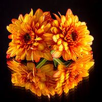 "Oranje Chrysanten weerspiegelt in de donkere ondergrond" is een macrofoto die ik gemaakt heb van twee oranje kleurige chrysanten, die op een spiegelend oppervlak liggen.