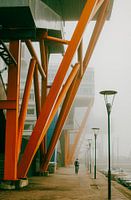 Krachtige oranje staalprofielen dragen een futuristisch gebouw langs de kade, terwijl lantaarns en een eenzame fietser wegvallen in de ochtendmist. Strakke lijnen, industrieel detail en zachte neveltinten maken dit tot opvallende wandkunst voor designliefhebbers en moderne interieurs—van woonkamer en kantoor tot hotel- of lobbyruimte.