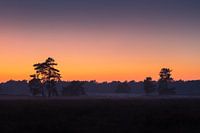 Deze foto laat een prachtige zonsondergang zien in de Loonse en Drunense Duinen. De lucht heeft een prachtige oranje gloed, waardoor de hele sfeer een rustgevende en bijna magische uitstraling heeft. Het landschap wordt dichtbij gebracht door de 400 mm telelens, waardoor de twee bomen in de voorgrond duidelijk zichtbaar zijn. De vlakken van de duinen en de warme lucht geven deze foto een aangename sfeer die doet denken aan een ontspannen wandeling door het mooie landschap.