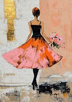 Oranje Jurk Gouden Achtergrond - Dit vrouwen schilderij toont een elegante vrouw van achteren gezien, met een opvallende, wijd uitlopende oranje-roze jurk en een bos roze rozen, tegen een achtergrond met abstracte gouden en crème tinten die rust en sereniteit uitstralen.