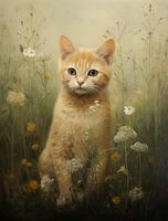 Deze schattige afbeelding toont een jonge, oranje kitten die nieuwsgierig zit tussen wilde bloemen en delicate grassen. Zijn grote, onschuldige ogen kijken met een speelse nieuwsgierigheid naar de wereld om hem heen, waardoor hij een aandoenlijke uitstraling krijgt. De warme tinten van zijn vacht passen prachtig bij de gele en witte bloemen die hem omringen, wat een harmonieus en zacht kleurpalet creëert. Het zachte daglicht benadrukt de pluizige textuur van zijn vacht en de fijne details van de bloemen, waardoor het geheel een dromerige en serene sfeer krijgt. Dit kunstwerk straalt een gevoel van vreugde en verwondering uit en nodigt de kijker uit om even stil te staan bij de eenvoud en schoonheid van een jong dier dat zijn omgeving verkent.
