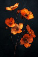 Dit schilderij vangt het oog met een weelderige pracht: een tak met fraaie oranje klaprozen staat trots centraal. Haar delicate bloemblaadjes spreiden zich uit als zijdezachte vleugels, elk detail nauwkeurig vastgelegd. Tegen een achtergrond in de tinten grijs en zwart, lijkt de klaproos bijna te zweven, haar levendige kleuren contrasteren met de donkere, mysterieuze ambiance eromheen. De compositie straalt een gevoel van kracht en tederheid uit, waar de natuurlijke schoonheid van de bloem harmonieus samenvloeit met de donkere achtergrond, waardoor een meeslepende visuele ervaring ontstaat die de toeschouwer uitnodigt tot verwondering.