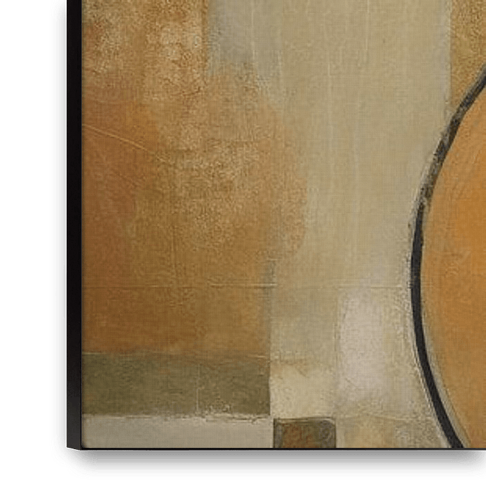 Oranje Ontmoeting - Dit schilderij toont een abstracte compositie met organische en geometrische vormen, gedomineerd door twee grote oranje cirkels, overlappende vlakken en lijnen die harmonie in de chaos brengen. De ingetogen kleurenpalet mixt oranje, groene en beige tinten met een hint van goud, wat het geheel een warme uitstraling…
