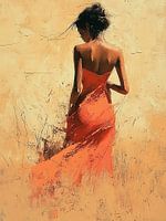 Details: vrouwenschilderij, moderne kunst, oranjejurk, rustieke achtergrond, sereniteit, levendige kleuren, rustgevend beeld, solo…