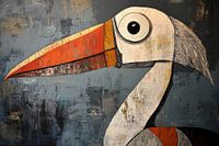 Oranje Snavel - Dit is een abstract schilderij van een grote, stilistische vogel met een levendig oranje en rood gekleurde snavel, een witte en grijze kop en een prominente zwarte oogvlek op een gedetailleerde, donkerblauwe en grijze achtergrond.