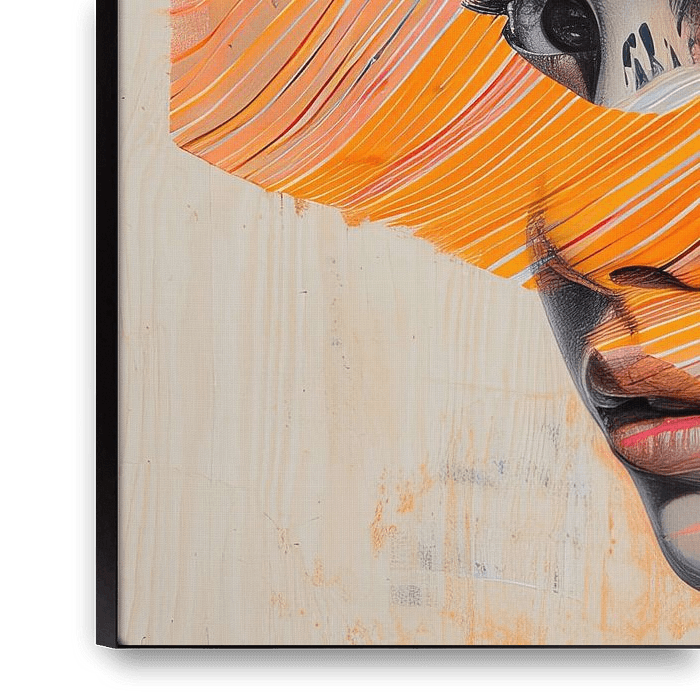 De achtergrond is sober, houtnerf zichtbaar onder dunne lagen verf, wat het geheel een organische draagvlakte geeft. Dat rustige hout zorgt dat het oranje echt kan stralen zonder te schreeuwen; het maakt het portret schilderij intiem. Kleine accenten — een veeg roze bij de kaaklijn, een hint van blauwgrijs onder de hals — geven kleurcontrasten die de realistische onderdelen meer volume geven. Technisch gezien is dit een werk van lagen: nauwkeurige penseelstreken voor het gezicht, expressieve, bijna grafische streken voor de oranje band, en een subtiele integratie waarbijdestrepensomsoverhetgezichtheenlopenensomseenopenvensterlatennaardeblik.Hetresultaatvoeltzowelmodernalsklassiek:eenportretdatnietalleen'wie'toont,maar'hoe'en'waarom'inkleurenritmevertaalt.