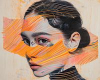 Oranje Strepen Vrouw - Dit werk kijkt je aan en fluistert tegelijk. Het is een vrouw schilderij waarin twee dingen de aandacht direct opeisen: het uitgewerkte, haast fotografische gezicht — vooral de ogen en lippen — en daaroverheen een brede, golvende oranje streep die als een sluier het portret doorsnijdt. De kunstenaar heeft gekozen voor die combinatie van hyperrealisme en uitgesproken abstractie om een spanning te maken tussen zien en verbergen: je ziet de blik scherp, en toch wordt ze gedeeltelijk gecodeerd door kleur en ritme. Het is een portret schilderij dat zowel aanwezig is als een raadsel biedt.