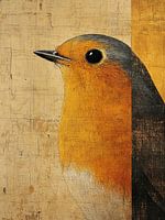 Oranje Vogel | Grijze Vogel met Oranje - Op dit vogel schilderij zie je een kleurrijke vogel met een feloranje borst en een opvallende grijze kop, tegen een lichtgele achtergrond.