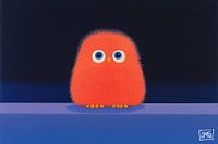 Oranje Wezen - Dit dierenschilderij toont een humoristisch, cartoonachtig, rond, fel oranje wezen met grote blauw-omrande ogen, zittend op een strak donkerblauw vlak tegen een nachtzwarte achtergrond.