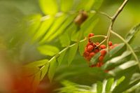 De rijpe, oranje bessen van een lijsterbes gefotografeerd door een waas van groene bladeren van de struik.
