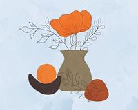 Minimalistisch-abstract stilleven van een grote oranje bloem en takjes met bladeren in een vaas, omringt van organische vormen en nog een takje. Modern stilleven in oranje, bruin en blauw.