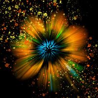 Abstracte afbeelding van een oranje bloem met verfspatten voor een artistiek effect aan de muur.