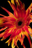 Deze oranje bloem is van achteren belicht, daardoor komt de bloem op je af.