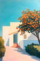 Een elegante, sneeuwwitte gevel rijst op onder een helderblauwe hemel, omringd door weelderig groen. Een prachtige sinaasappelboom bloeit letterlijk met helder fruit en vult het beeld met een vleugje zoete frisheid. Het zachte pad nodigt je uit om het verborgen paradijs achter de deur te verkennen. Een rustig moment van levensvreugde.