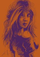 Dit kunstwerk is gemaakt als duotone print. Het werk is uitgevoerd in oranje tint in combinatie met paars. Op dit kunstwerk zie je een vrouw die over haar schouder naar je kijkt . Bestel deze wanddecoratie en geef je muur karakter.