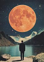 Een man in pak staat aan de oever van een meer en staart naar een grote, oranjekleurige maan. De scène is ontworpen in de stijl van een collage, met een surrealistische, kosmische sfeer met sterren en sterrenstelsels op de achtergrond.