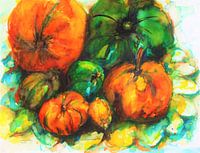 De verschillende pompoenen liggen met hun herfstkleuren als een stilleven op een zilveren schaal . Herfst overgang van de kleurrijke zomer kleuren naar de grijze winter.