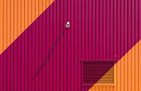 Tegenwoordig hebben de gebouwen op industrieterreinen de gekste kleuren. Dit gebouw, op een industrieterrein in Best, was in rode en oranje brede strepen geverfd. Het rooster vormt een welkome onderbreking in deze minimalistisch compositie