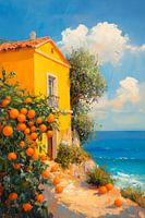Een felgeel huis nestelt zich tegen de kust, terwijl sappige oranje appels het landschap tot leven brengen. Zachte golven dansen op de achtergrond en witte wolken drijven rustig door een helderblauwe lucht. De geur van citrusvruchten en het geluid van de zee creëren hier een idyllisch tafereel dat uitnodigt om te blijven hangen.