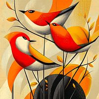 "Oranje in Vleugelvlucht" is een boeiend en abstract kunstwerk dat de schoonheid van de natuur op een moderne en vernieuwende manier uitbeeldt. Het werk toont drie oranje gekleurde vogels die rustig in de takken van een boom zitten. De levendige oranje tinten van de vogels vormen een opvallend contrast met de meer gedempte kleuren van de boom en de achtergrond, waardoor ze direct de aandacht trekken.