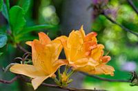 Licht en donkere tinten oranje bloemen heeft de Azalia plant in mijn tuin.