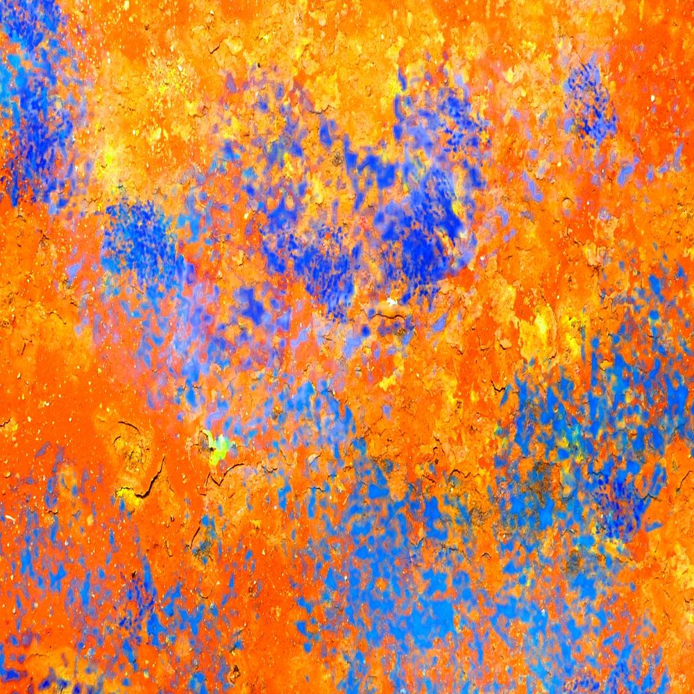 Een fantasie werk gemaakt van een foto van een roestige metalen plaat. Het is een abstract met contrast kleuren. Oranje verloopt naar rood en de verschillende kleuren blauw vind ik er mooi bij passen.