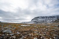 Oranje en geel mos met rotsen en licht besneeuwde bergen op het Aurlandfjord in Noorwegen tijdens een bewolkte herfstdag .