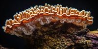Dit prachtige kunstwerk toont de levendige kleuren van het vuurkoraal, met licht oranje paddenstoelen die dansen op het canvas. Het werk is ontstaan uit onderwater makrofotografie, waarbij de kunstenaar de schoonheid van de onderwaterwereld vastlegt en deze omzet in kunst.