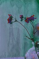 Lieflijke oranje/rode Gaum bloempjes in een klein glazen vaasje. In de tuin heel mooi maar ook binnen in huis heel decoratief. Lila/groene achtergrond.