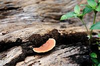 Dit beeld belicht twee kleine oranje paddenstoelen die op een oude, rottende boomstam groeien, wat een zowel discreet als fascinerend tafereel oplevert. Het hout, getekend door het verstrijken van de tijd, onthult zijn versleten lagen en scheuren, geaccentueerd door grijs- en bruintinten. Op dit natuurlijke canvas vallen de paddenstoelen op door hun levendige kleur, die contrasteert met het ruwe materiaal waarin ze zijn gevonden. Hun delicate vorm roept kwetsbaarheid op, maar ook de veerkracht van het leven, dat zelfs te midden van dode materie herboren wordt. Dit tafereel illustreert perfect de natuurlijke cyclus waarin ontbinding nieuw bestaan voedt. Elk detail - de textuur van het hout, de fijne randen van de paddenstoelen, de donkere grondsporen - herinnert aan het belang van deze onzichtbare processen die het bos in staat stellen te regenereren. Als je goed kijkt, zie je de harmonie tussen rottende materie en leven in wording. Een foto die uitnodigt om stil te staan bij de verborgen schoonheid van het kreupelhout en de stille vindingrijkheid van de natuur.