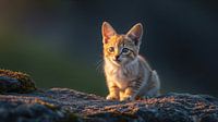 Een klein, oranje tabby kitten zit neergestreken op een rots met textuur, verlicht door een warm licht tegen een donkere, onscherpe achtergrond.