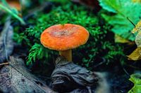 Close up van een wilde oranje paddenstoel tussen de bladeren. Een mooie macroscène in de herfst tijdens een wandeling door een bos.