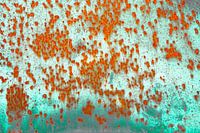 Oranje regen...is dit geval een zegen. Metalen roestige plaat gefotografeerd en de kleuren zodanig bewerkt dat ze van het beeld afspatten. De kleur cyaan lijkt op te lichten en de oranje spetters erop lijken los te komen van de achtergrond.